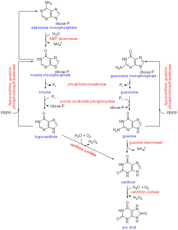 Click here to see the pathway for uric acid synthesis from AMP and GMP.